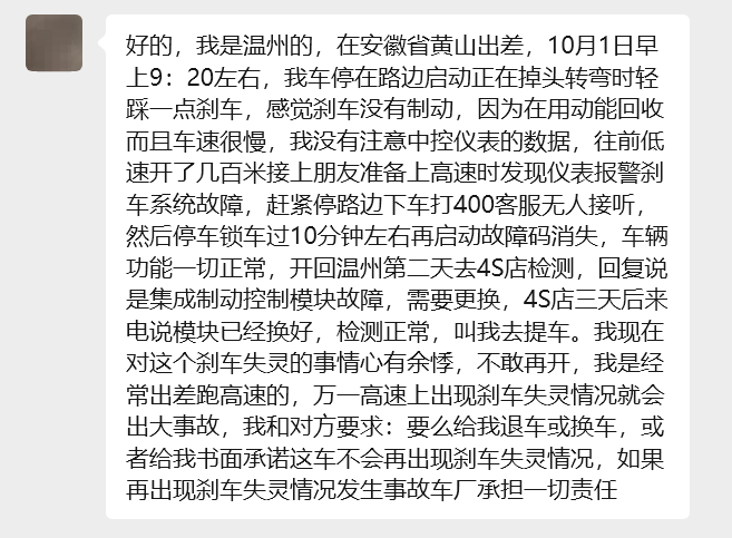 10 月 1 日,张先生在安徽省黄山出差时,遭遇车辆刹车问题。当日上午 9 时 20 分左右,他将车停在路边启动后掉头转弯,轻踩刹车时感觉无制动;因车辆处于动能回收状态且车速慢,他未留意中控仪表数据,往前低速行驶数百米接上朋友、准备上高速时,仪表报警显示刹车系统故障。