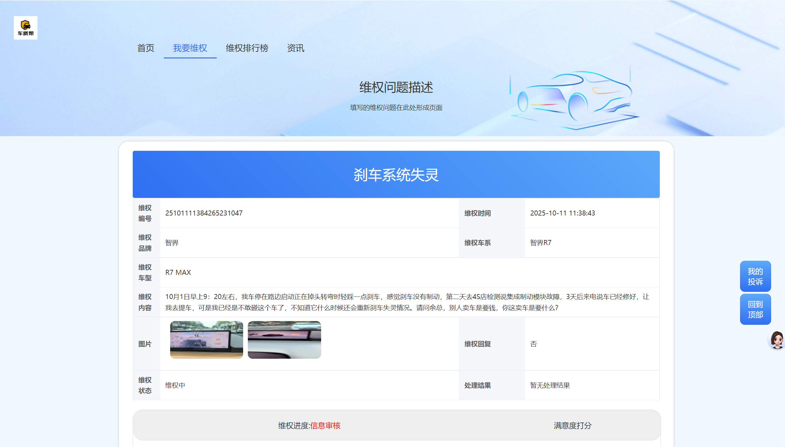 最后提醒一下大家,遇到用车、售后问题无需妥协,也不必被 “正常现象” 的借口劝退。您可以搜索车质帮小程序与或者登录WWW.AUTO315.CN网站,以规范的流程、明确的证据主张权益,既能避免陷入 “维权耗力” 的困境,也能推动车企重视售后责任。